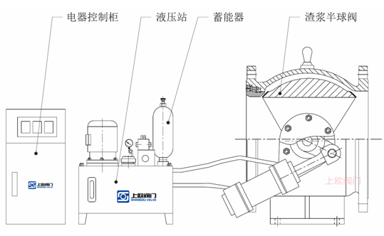 蓄能式液壓系統結構緊湊,可置于閥門聯接架上或置于閥門附近,由液壓站、液壓缸和電氣控制箱組成。