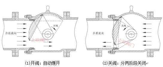 4、不積渣、零水損:如下圖所示,閥門采用全流道設計,當閥門全開時,半球形閥芯處于流道一側,不占用流道空間阻礙流體的通過,不易產生積渣與渦流,特別適合含渣量高與流速高的"雙高"介質。