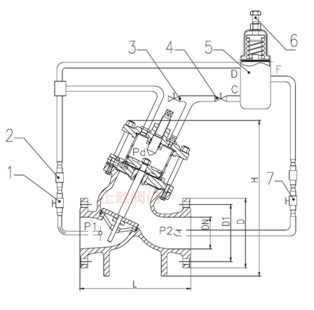 本閥門由主閥和外控組件組成,主閥由閥體、閥桿、閥板、閥蓋、閥座、活塞和活塞缸及調整螺桿等構成,外控部件主要由先導閥、調節閥、手動球閥等組成。