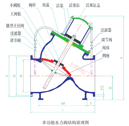 由主閥和外控組件構(gòu)成。主閥由閥體、大小閥板、閥桿、閥蓋、閥座及活塞、活塞缸等構(gòu)成,外控組件由微止回閥、調(diào)節(jié)閥、過濾器及相應(yīng)管路構(gòu)成。外控組件中一路連通閥進口端與活塞缸下腔,另一路連通閥出口端與活塞缸上腔
